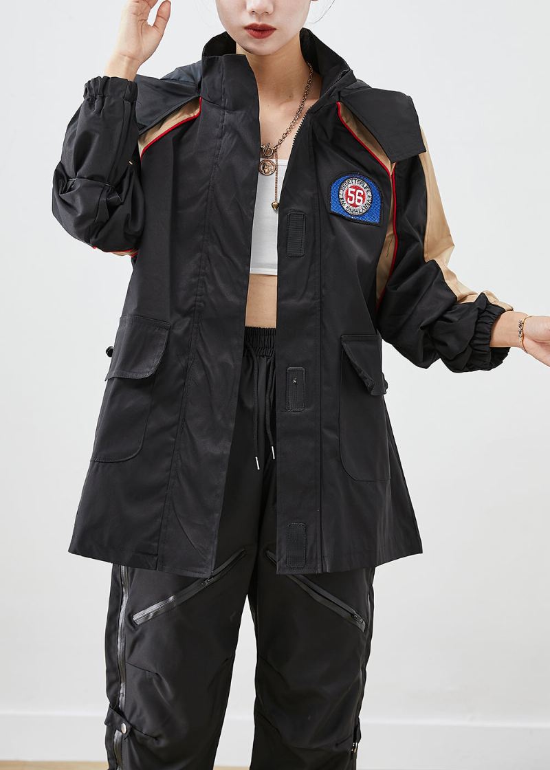 Håndlaget Svart Hette Patchwork Applikasjon Spandex Jakke Høst