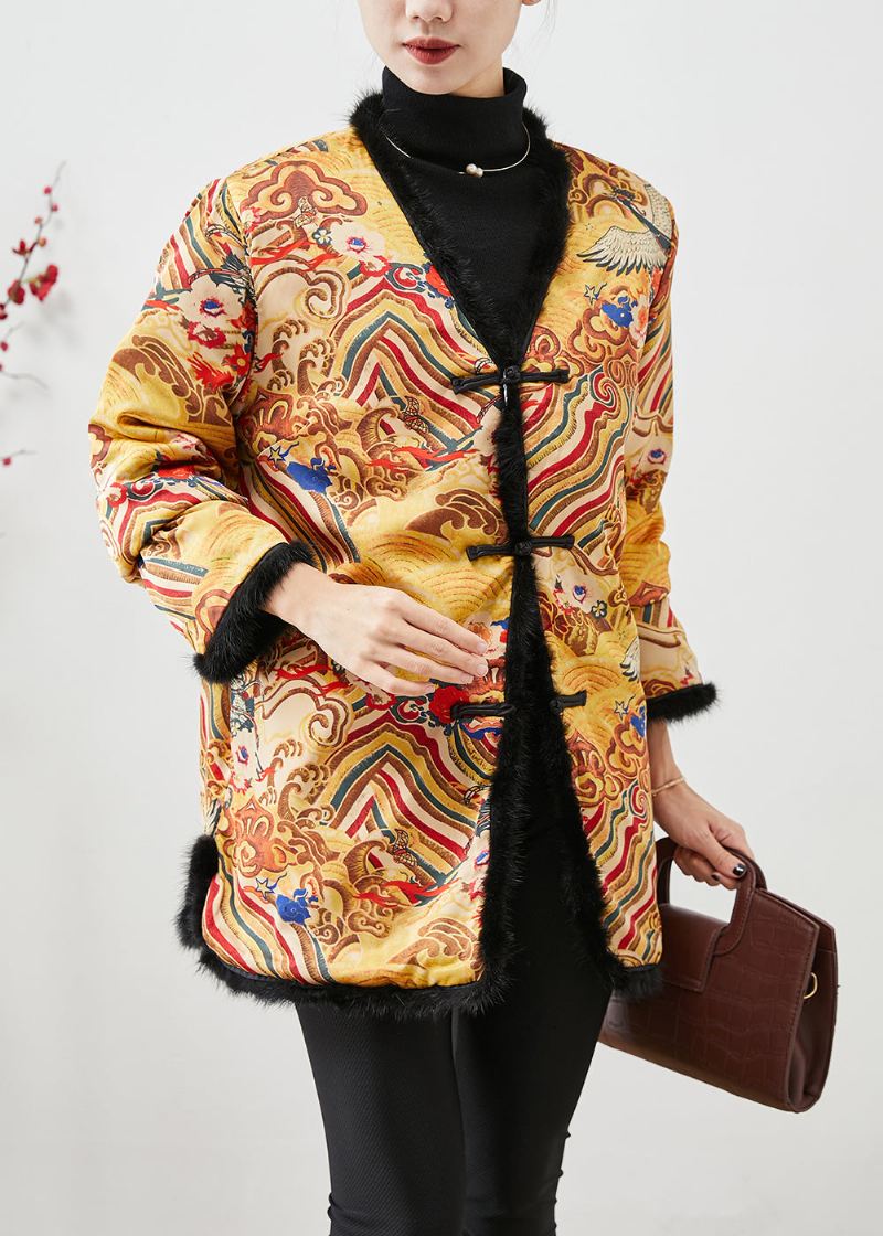 Kinesisk Stil Gul Print Patchwork Mink Hår Fin Bomull Fylt Kåper Vinter