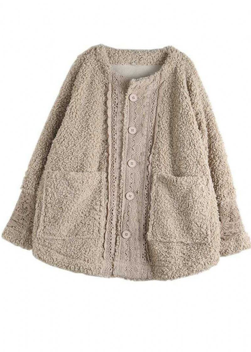 Plus Size Khaki O-neck Lacer Patchwork Teddy Faux Fur Parka Winter