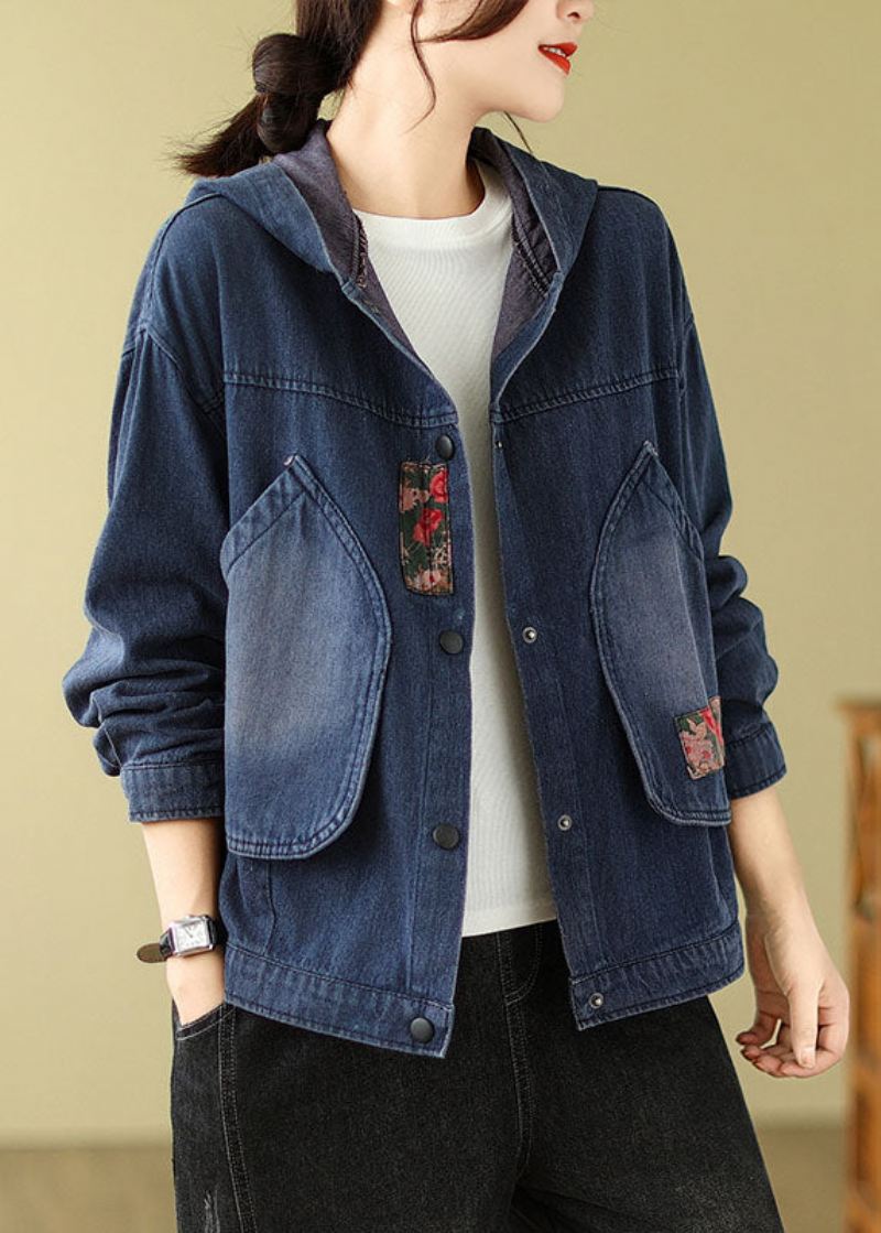 Retro Denim Blå Lommer Print Hette Kåper Høst