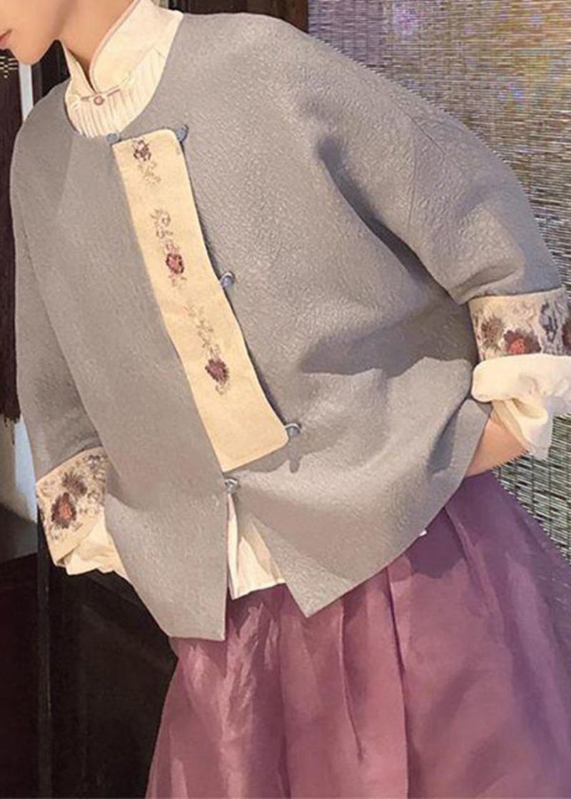 Vintage Grå O-hals Knapp Patchwork Ulljakke Vinter